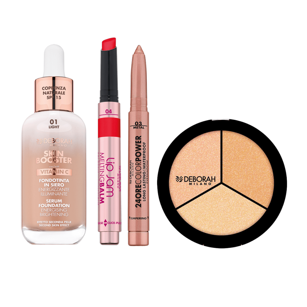 Dopřej své pleti sjednocený, svěží a rozzářený vzhled s touto výhodnou sadou bestsellerů značky Deborah Milano. V jednom balíčku najdeš vše, co potřebuješ pro rychlé a spolehlivé líčení – od lehkého sjednocení pleti, přes jemné rozjasnění až po praktické líčení očí a šťavnaté rty.