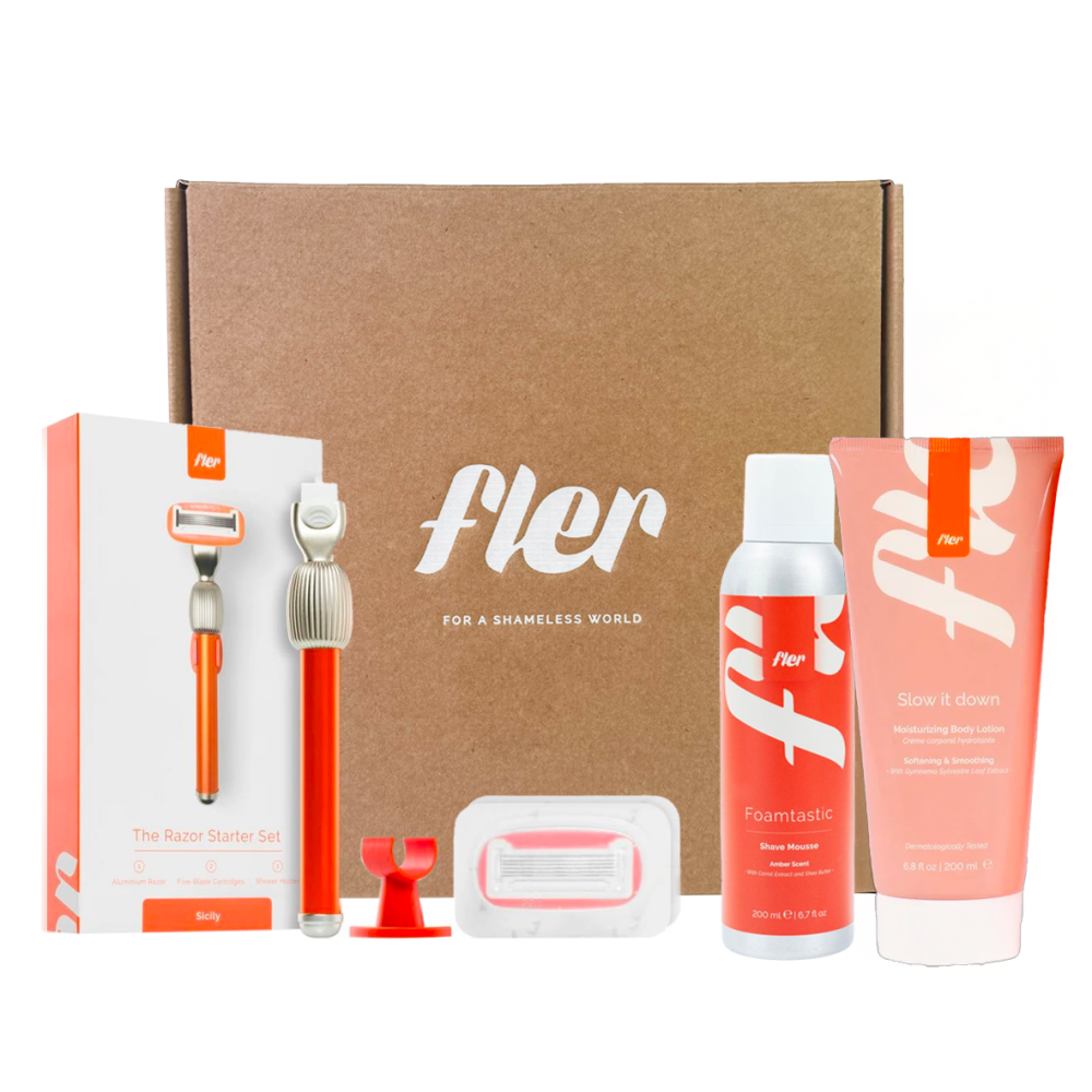 Obsahuje holicí strojek Fler, nástěnný držák a 2 pětibřité hlavice, Foamtastic Amber - dokonalou pěnu na holení, a Slow It Down - rychle se vstřebávající tělový krém pro zklidnění a hloubkovou hydrataci pokožky po holení.