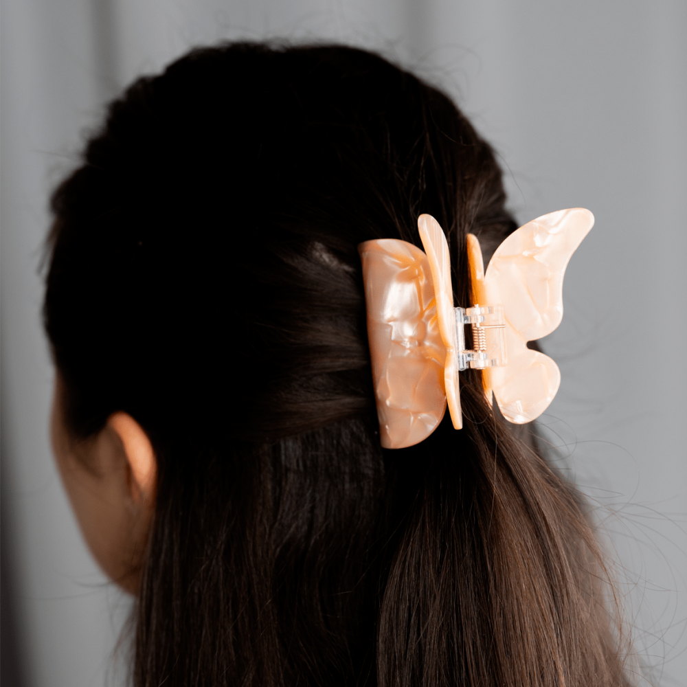 Stylový skřipec ve tvaru motýlka v jemné broskvové barvě s perleťovým efektem. Praktický doplněk, který tvým vlasům dodá šmrnc a zároveň je spolehlivě udrží na místě.